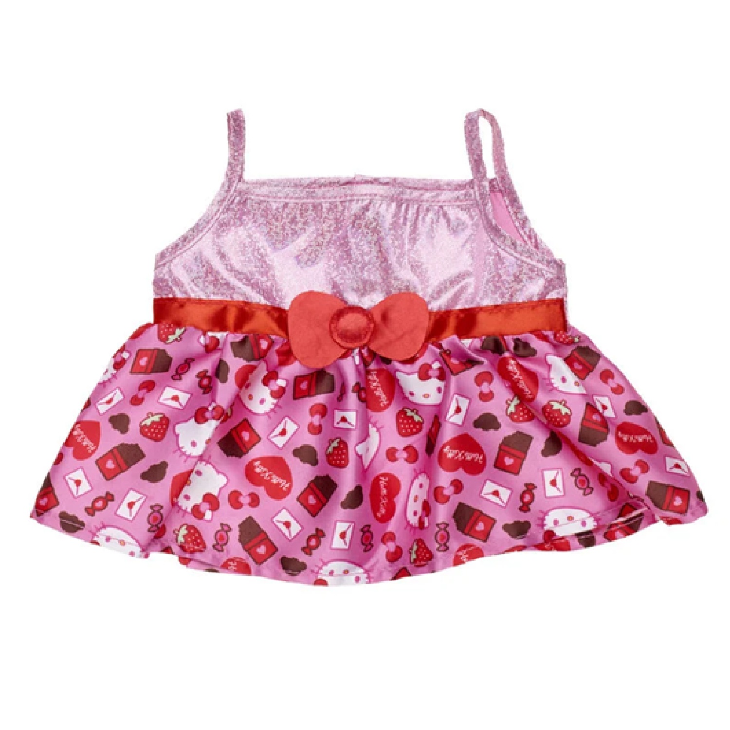 This pink Hello Kitty® dress for stuffed animals has an all-over pattern of hearts, love notes, chocolates and other sweet icons.