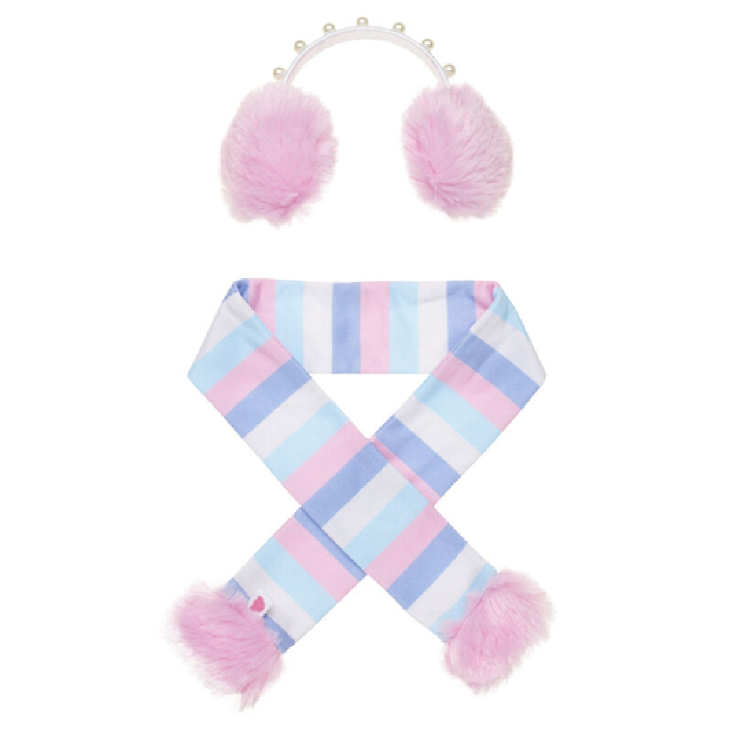 This stuffed animal earmuffs and scarf set includes faux pearls on the fuzzy pink earmuffs and pink poms on the colorful striped scarf.