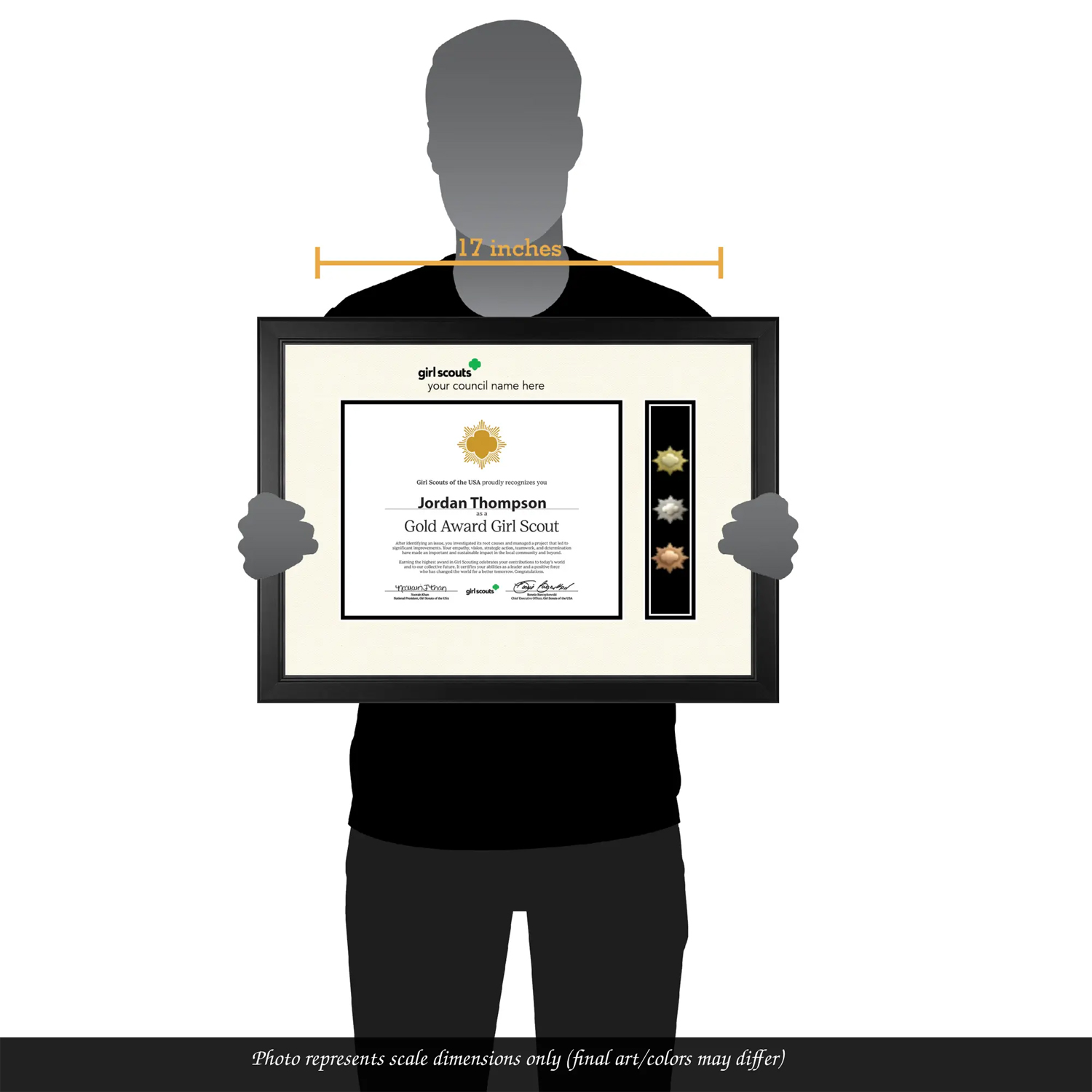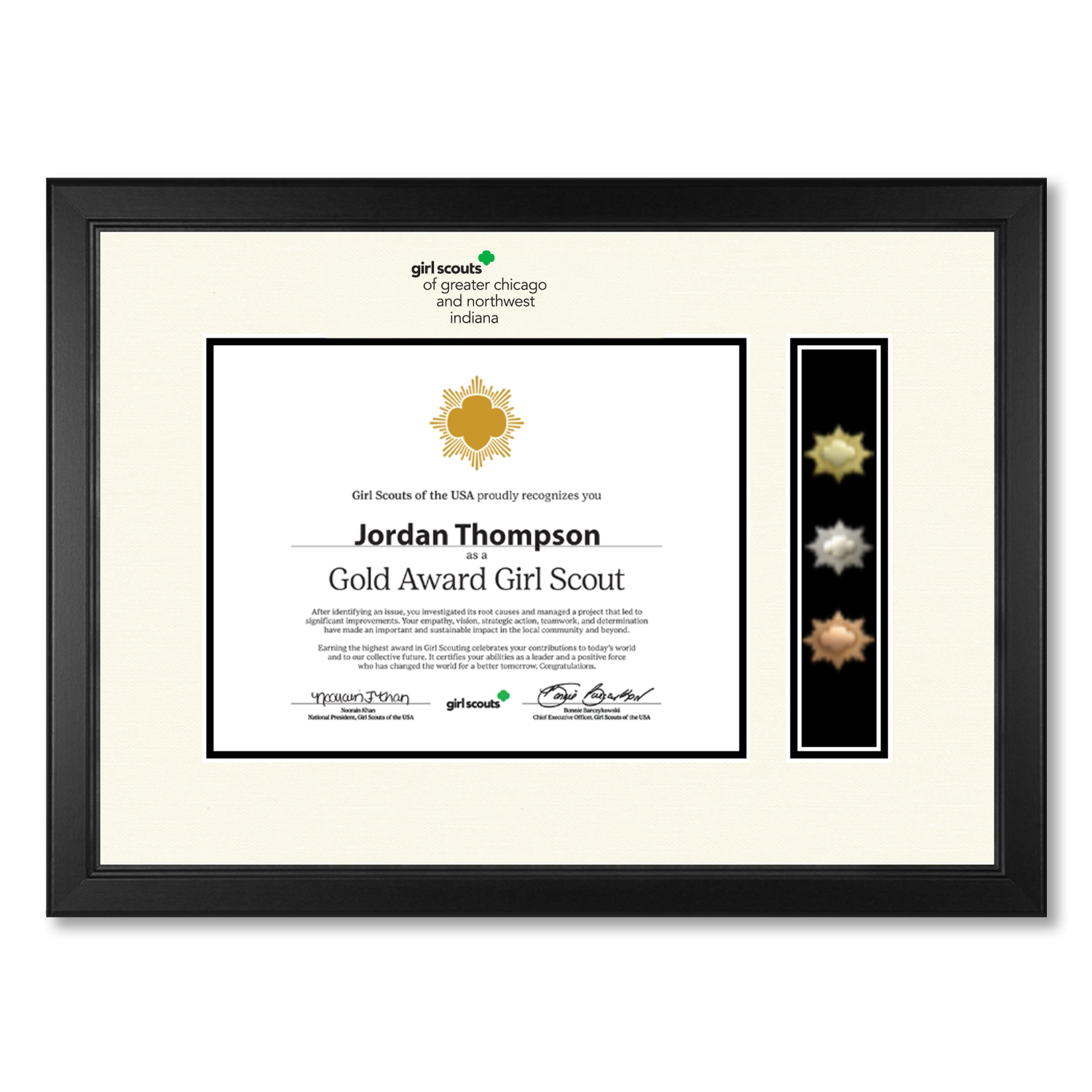 Display your hard-earned Girl Scout certificate alongside your Girl Scout Bronze, Silver, and Gold Award pins in museum-quality textured ivory and black matting accentuated with the Girl Scouts of the USA logo and council name in vibrant raised inks.
