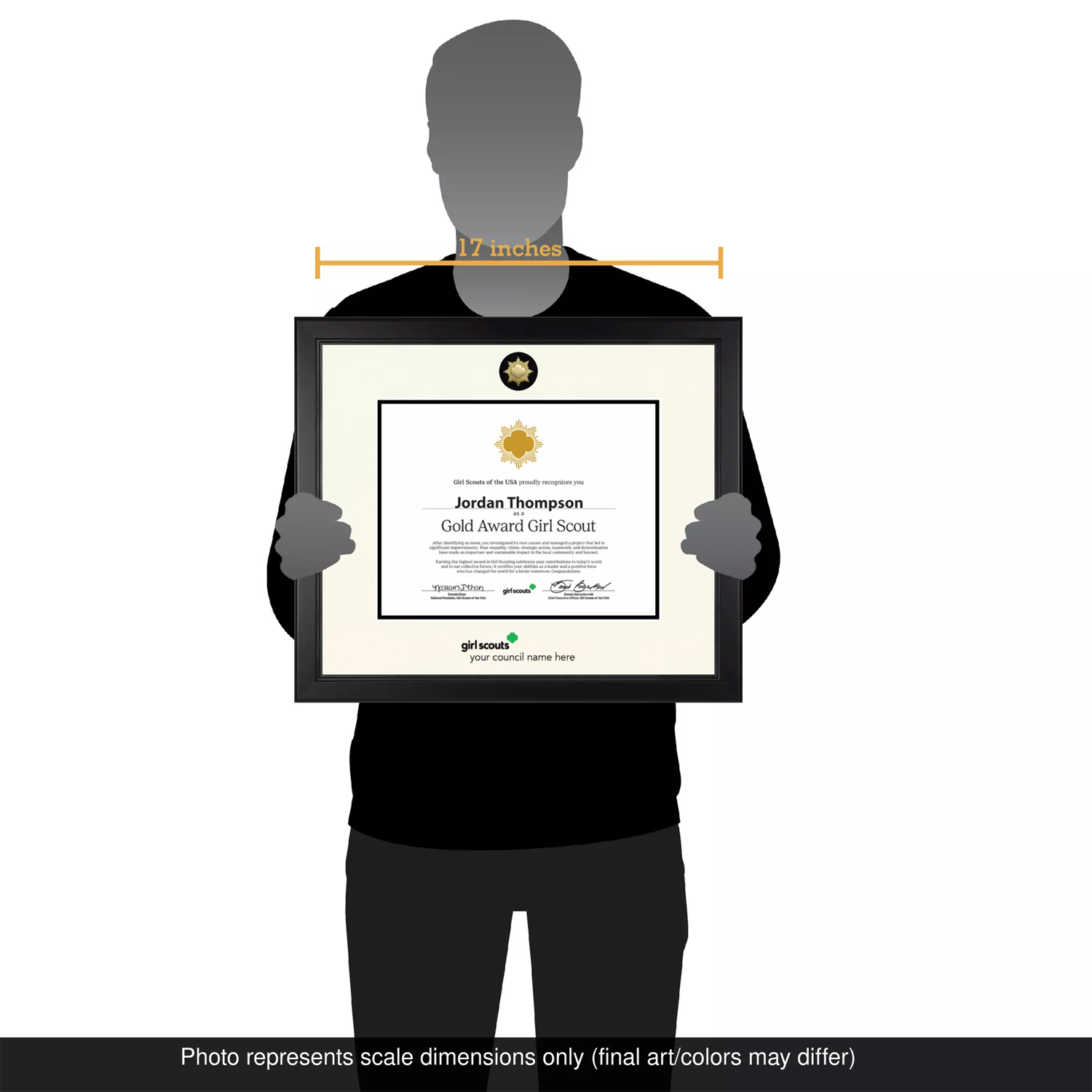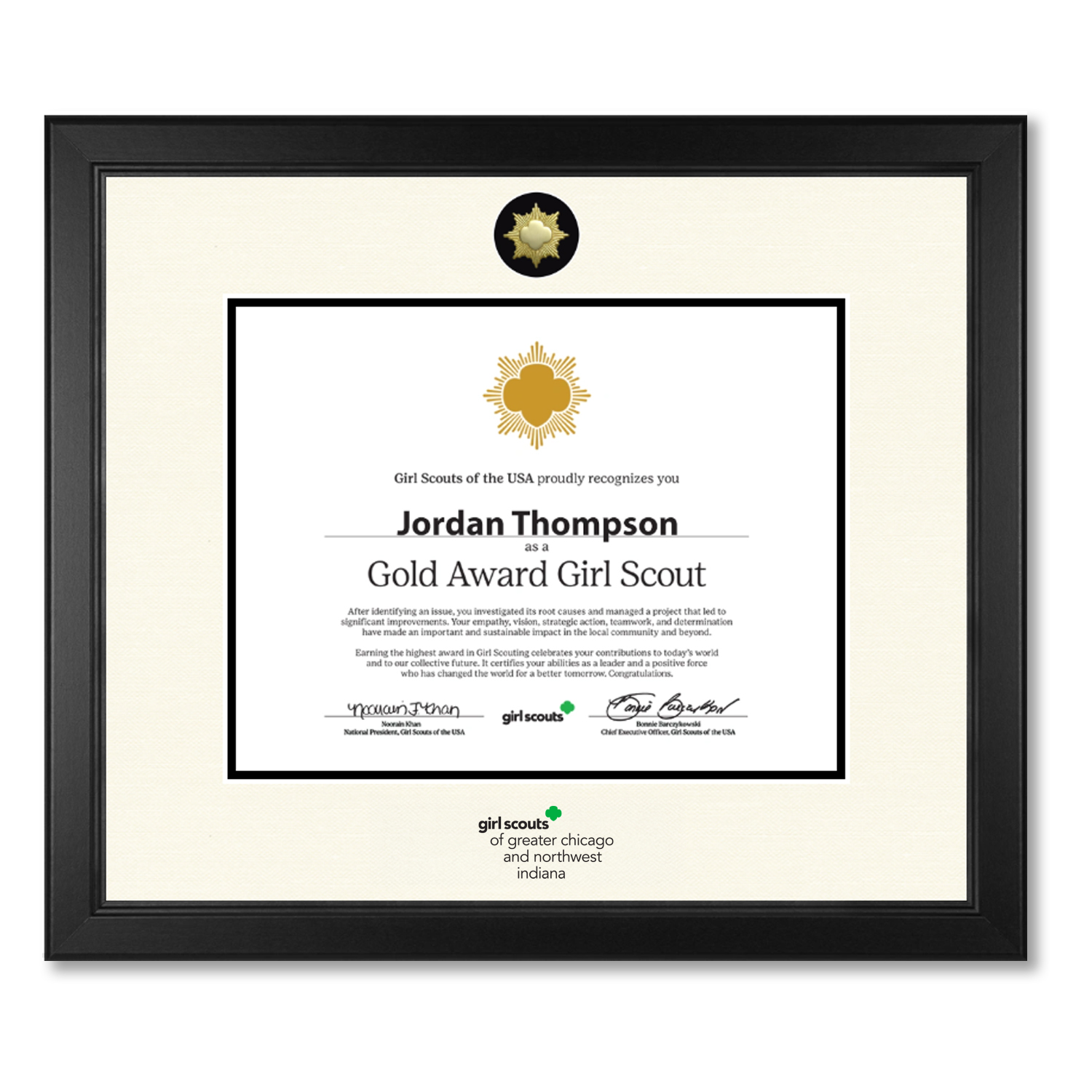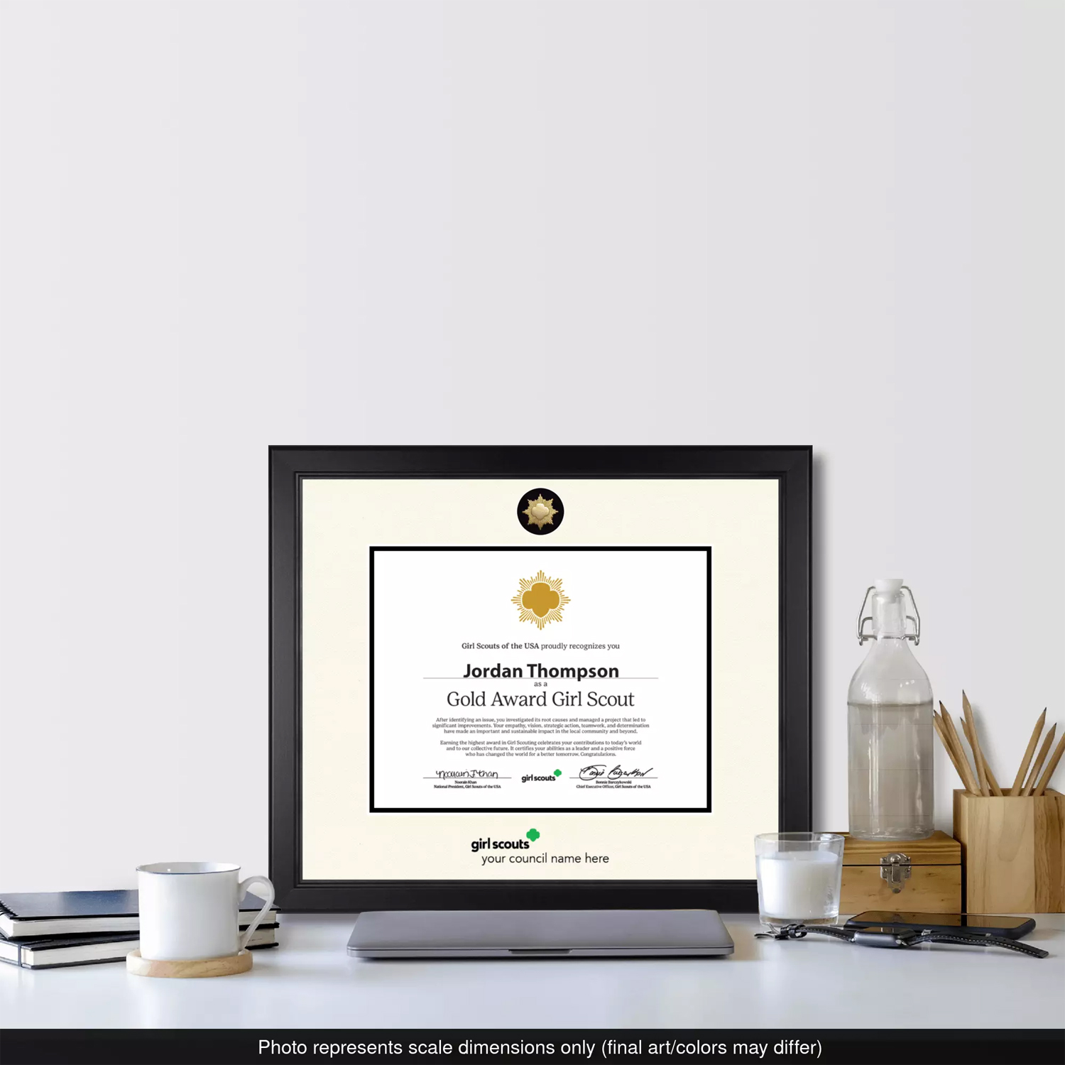 Display your hard-earned Girl Scout certificate alongside your Girl Scout highest awards pin in museum-quality textured ivory and black matting accentuated with the Girl Scouts of the USA logo and council name in vibrant raised inks.