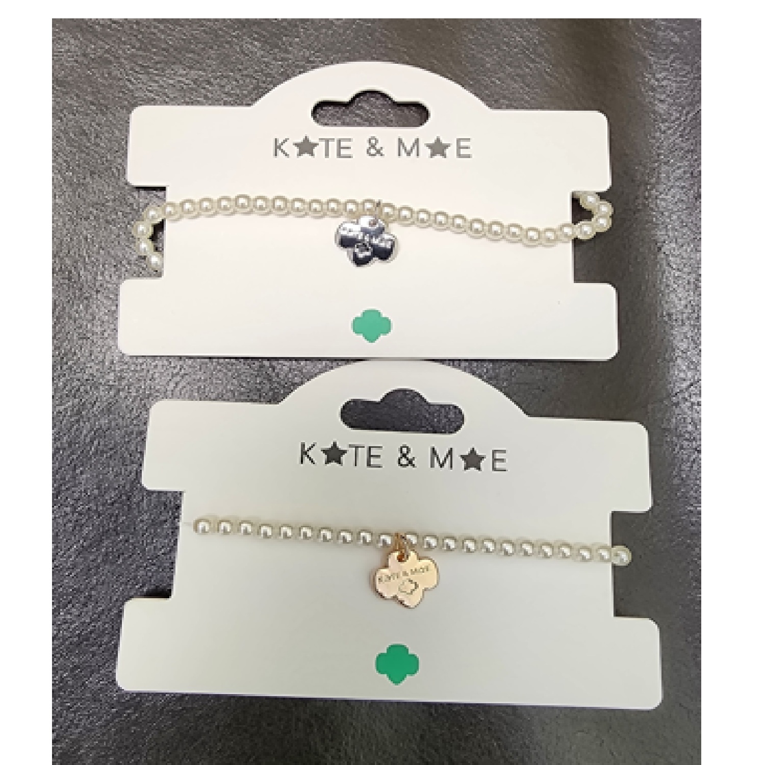 Kate & Mae stretch pearl bracelets with Gold or Silver Trefoil Charm.